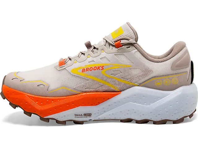 The Brooks Caldera 7 is a trail running shoe designed to offer maximum cushioning and stability for long-distance runners. Featuring Brooks' DNA Loft v3 midsole, which is nitrogen-infused, the Caldera 7 provides a plush yet responsive ride. The shoe's engineered mesh upper and TPEE overlays ensure breathability and a secure fit, while the wide toe box accommodates various foot shapes, making it ideal for extended wear on moderate trails.