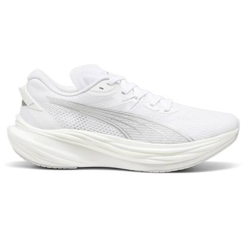 The Puma Deviate Nitro 3 is a versatile carbon-plated performance trainer designed for various running needs. This latest iteration features a full-length Nitro Elite foam midsole, providing a blend of soft landings and energetic take-offs, making it suitable for both easy paces and faster efforts. The upper, crafted from engineered mesh with PWR tape overlays, ensures a snug and breathable fit, while the padded collar and gusseted tongue enhance comfort without adding bulk.