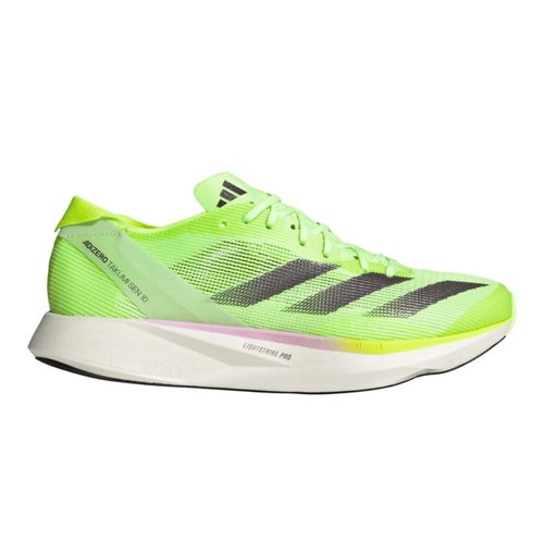 The Adidas Adizero Takumi Sen 10 is a lightweight racing shoe designed for speed and efficiency, particularly suited for 5K and 10K distances. This latest version features a refined setup that includes a double layer of Lightstrike Pro foam for improved impact reduction and energy return. The EnergyRods 2.0 system, now made from recycled glass fiber, enhances propulsion while providing a snappy, responsive ride. The minimalistic, engineered mesh upper offers excellent breathability but may feel tight for those with wider feet.
